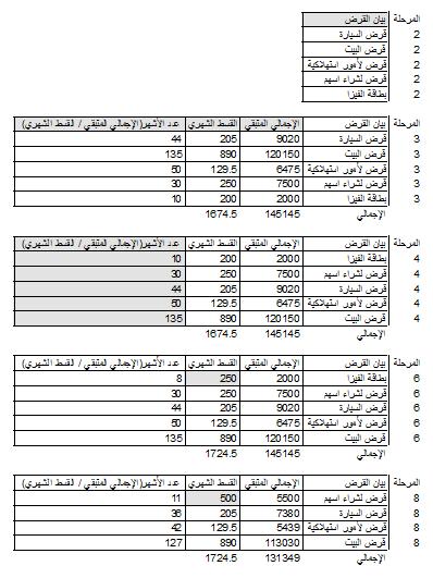 3- اضف هذه الخانات على القائمة السابقة (القيمة الإجمالية المتبقية عليك – الدفعة الشهرية – عدد الإشهر المتبقية لديك حتى تسدد هذا الدين).